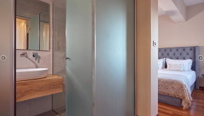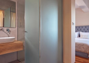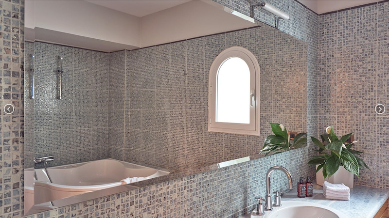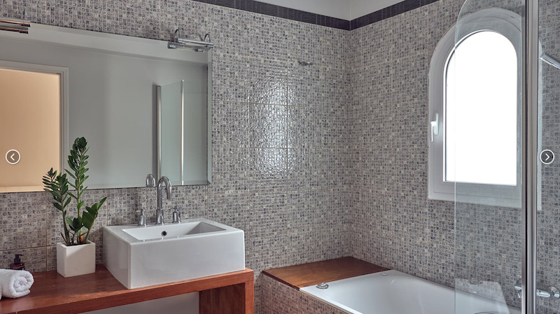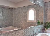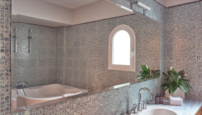 Kúpeľňa s úžasným luxusom: tri izby disponujú vlastnou kúpeľňou s vírivkou a vkusným mozaikovým obkladom, ktorý dotvára atmosféru wellness relaxu.