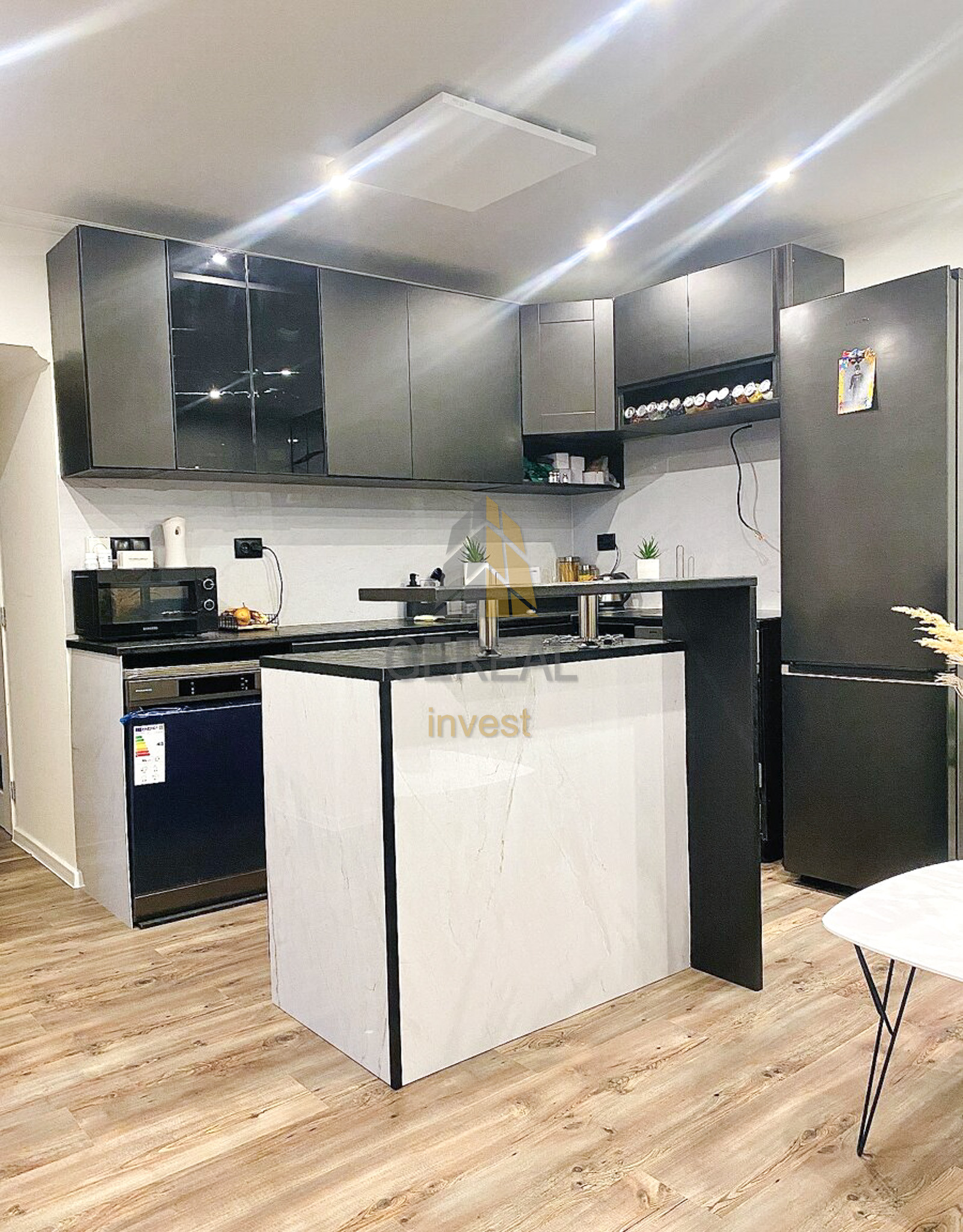 - Nová kuchynská linka so spotrebičmi: indukčný sporák, umývačka riadu, chladnička a mikrovlnná rúra.