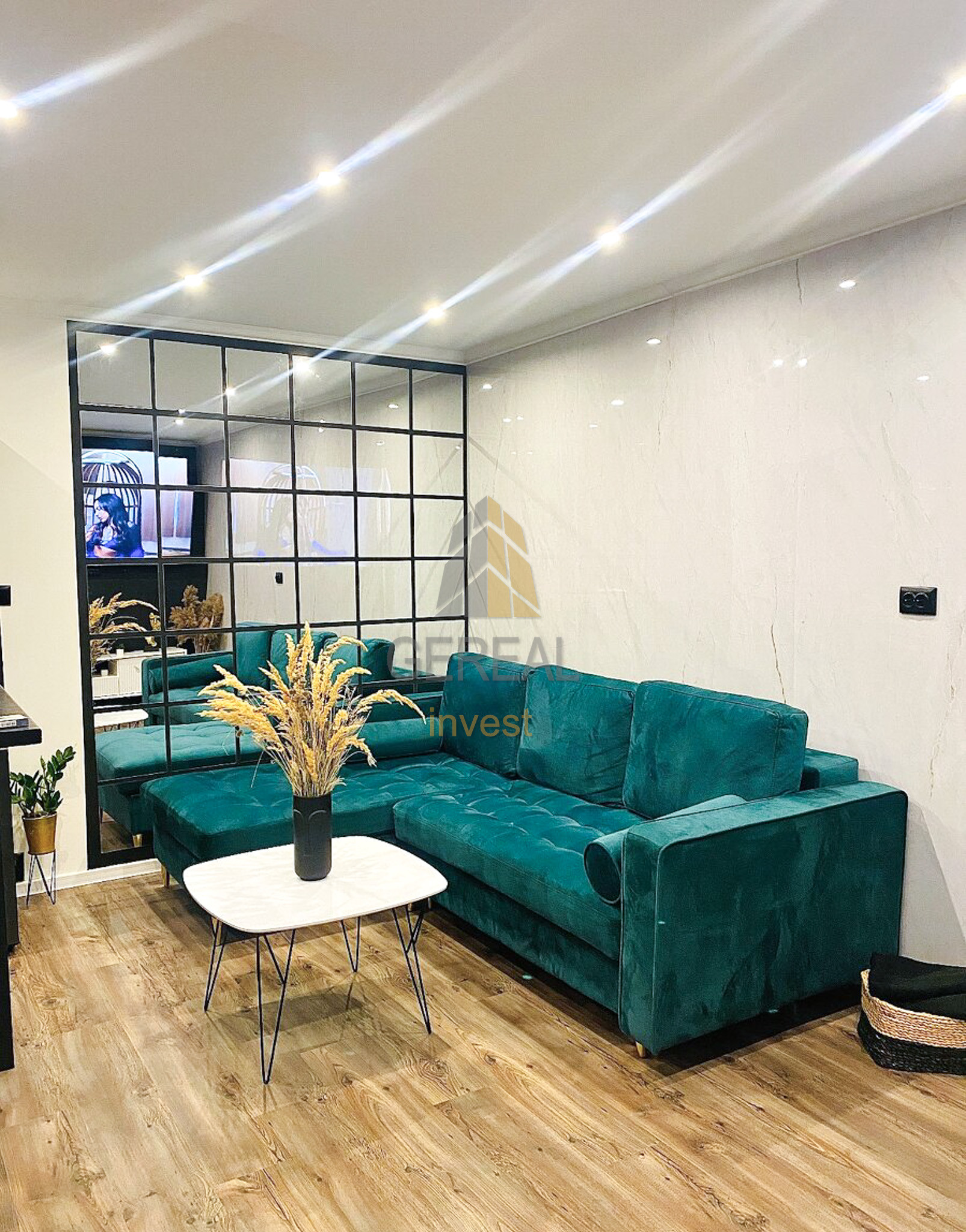 - Dizajnová zrkadlová stena v obývacej izbe.
